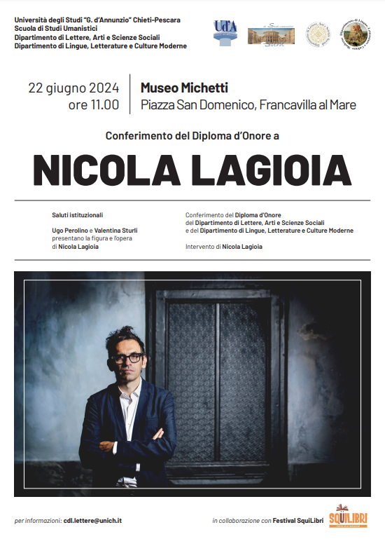 Sabato 22 giugno, alle ore 11:00, nella sede del Museo Michetti in Piazza San Domenico a Francavilla al Mare, si terrà la cerimonia di conferimento del Diploma d’Onore del Dipartimento di Lettere, Arti e Scienze Sociali e del Dipartimento di Lingue, Letterature e Culture Moderne dell’Università “Gabriele d’Annunzio” di Chieti-Pescara allo scrittore Nicola Lagioia. Nicola Lagioia (Bari 1973) autore di numerosi racconti, saggi e romanzi, tra cui si ricordano Occidente per principianti (2004), Riportando tutto a casa (2009), La ferocia (2014) e La città dei vivi (2020), tutti pubblicati per Einaudi. Dal 2017 al 2023 è stato direttore del Salone Internazionale del Libro di Torino.