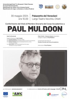 Giovedì 30 maggio, alle ore 10:00, nella sede di Palazzetto dei Veneziani, in Largo del Teatro Vecchio a Chieti, si terrà la cerimonia di conferimento del titolo di Membro Onorario del Corpo Accademico dell’Università “ Gabriele d’Annunzio” di Chieti-Pescara al professor Paul Muldoon.