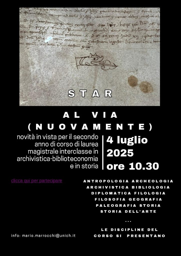 Le novità in vista per il secondo anno di corso di laurea magistrale interclasse archivistica-biblioteconomia e in storia “Studi storici e patrimonio scrittorio dall’antichità all’età contemporanea” (STAR – LM 5 / 84) verranno presentate on-line venerdì 4 luglio alle ore 10.30.