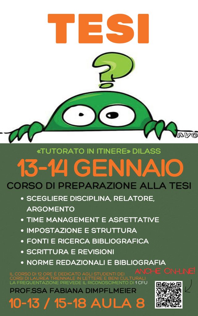 Nelle giornate di martedì 13 gennaio e mercoledì 14 gennaio 2026, presso l’Aula 8 del Polo Didattico del Campus di Chieti, dalle ore 10 alle 13 e dalle ore 15 alle 18, la Prof.ssa Fabiana Dimpflmeier terrà il Corso di preparazione alla tesi dedicato agli studenti delle Lauree triennali in Lettere e Beni culturali del DiLASS (Tutorato in itinere).